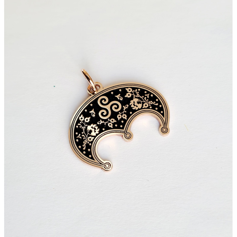 Zawieszka wykonana jest z polerowanego srebra 925, została głęboko wygrawerowana i ręcznie wypolerowana, a w zagłębieniach przyciemniona naturalną patyną. Średnica ok 25 mm.