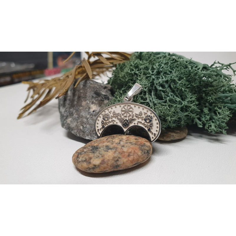 Zawieszka wykonana jest z polerowanego srebra 925została głęboko wygrawerowana i ręcznie wypolerowana, a w zagłębieniach przyciemniona naturalną patyną. Średnica ok 25 mm.