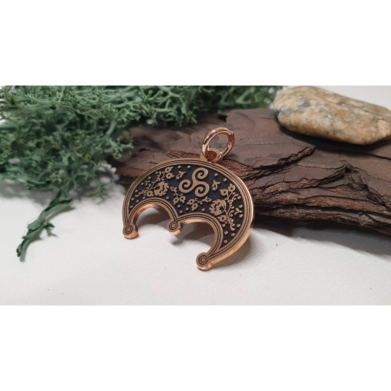 Zawieszka wykonana jest z polerowanego brązu, została głęboko wygrawerowana i ręcznie wypolerowana, a w zagłębieniach przyciemniona naturalną patyną. Średnica ok 25 mm.